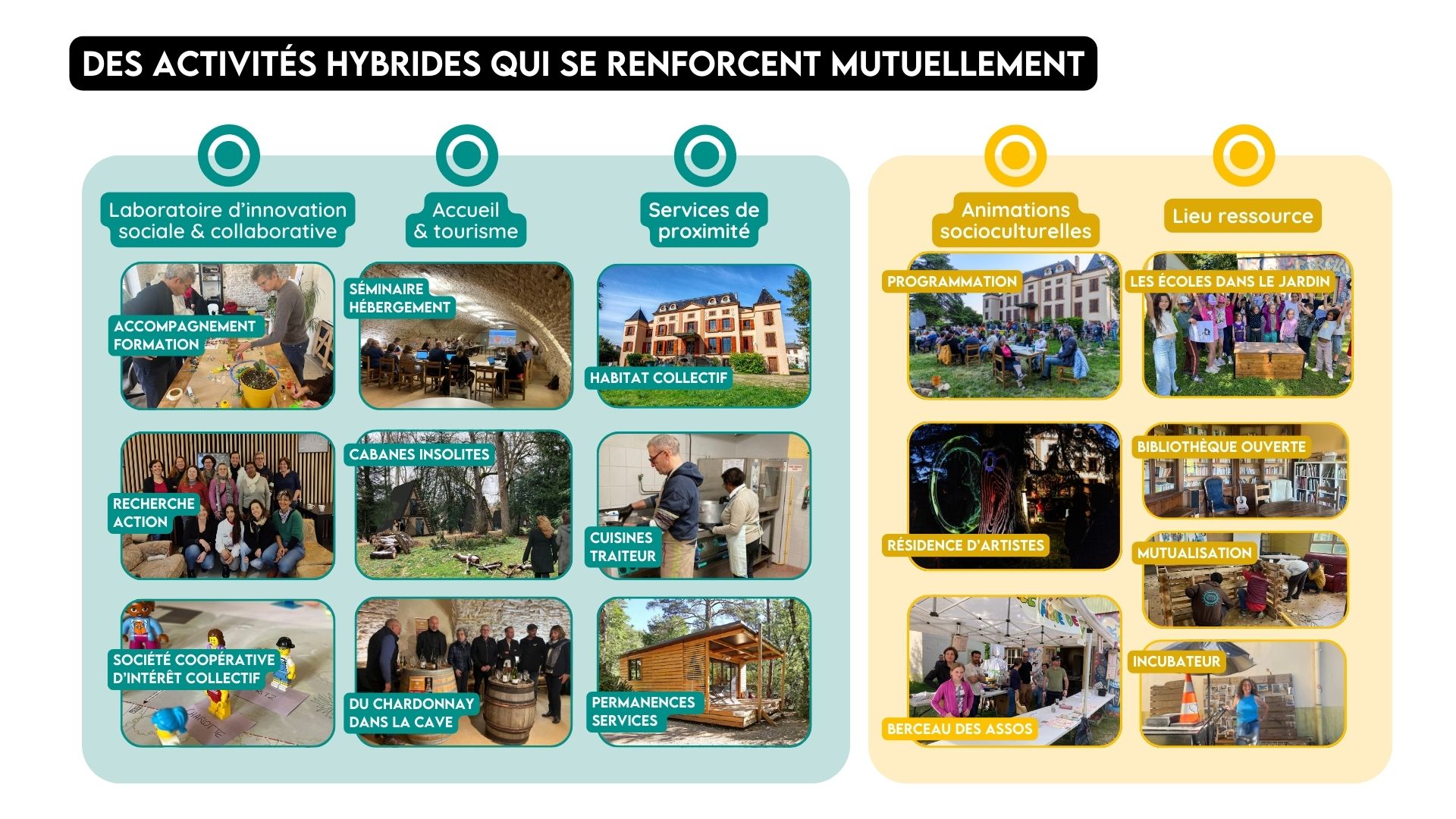 Le site fonctionne grâce à deux grands poumons complémentaires : un pôle économique qui assure la viabilité du lieu, et un pôle social & culturel qui garantit son ouverture, son utilité et son ancrage territorial.