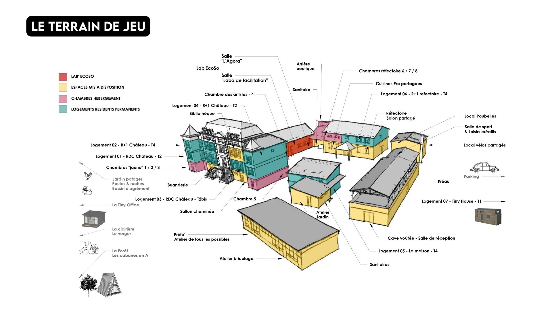 Sociales : Programmation socioculturelle, Résidences d’artistes, Berceau des associations, Écoles dans le jardin, Bibliothèque ouverte, Matériauthèque créative, Mutualisation, incubateur, actions de remobilisation.